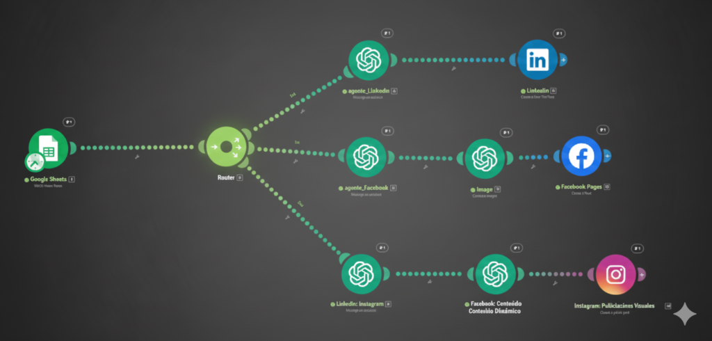 • 2. Inteligencia Artificial (IA): El nodo de IA (ChatGPT) no solo genera el texto, sino que lo adapta al tono de cada red social y genera imágenes relevantes.